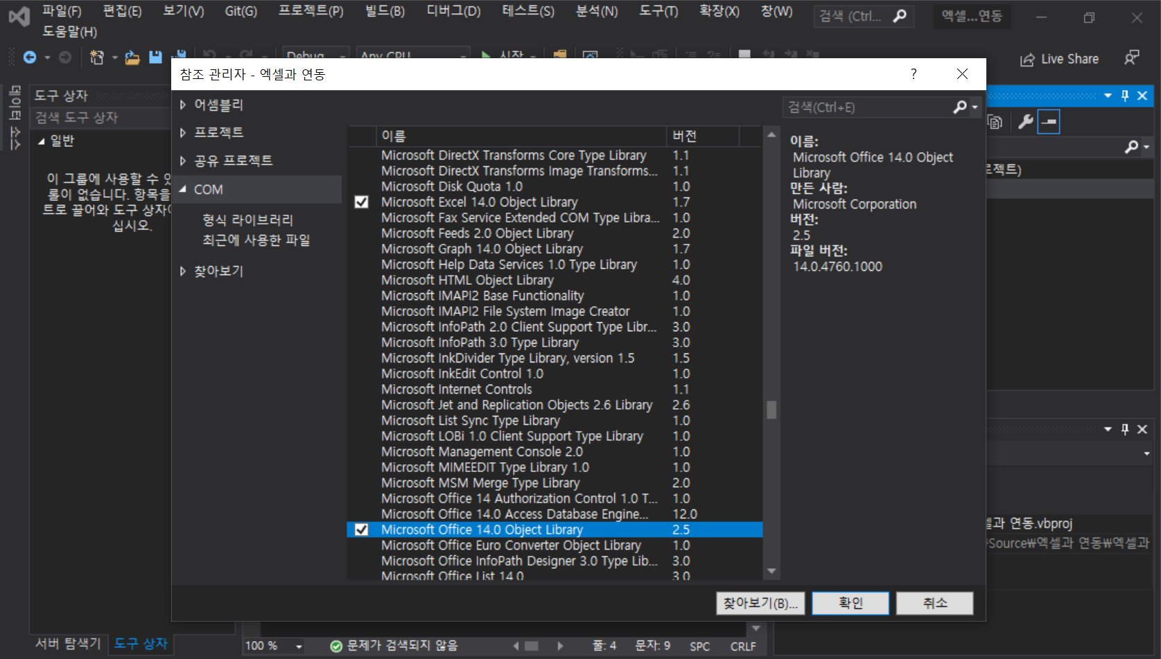 Excel과 연동을 하기 위해서 Microsoft excel 14.0 Object Library를 추가해주세요.