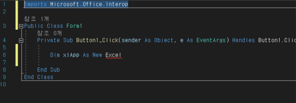 먼저, 가장 위에 'Imports Microsoft.Office.Interop'를 입력해주세요.